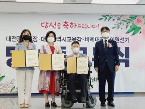 [굿모닝충청 박종혁 기자] 대전선관위는 3일 대전광역시장, 대전광역시교육감 및 비례대표대전시의회의원선거 당선자에게 당선증을 교부했다.이장우 국민의힘 대전시장의 당선증은 일정 문제로 인해 대리인이 수령했다.대전선관위 양태경 위원장은 당선인들에게 “우리 지역의 발전을 위하여 공약한 사항들을 충실하게 이행하기를 바라며, 유권자로부터 오랫동안 기억에 남는 훌륭한 공직자로 평가되길 바란다”고 전했다.한편, 기초단체장과 광역·기초의원 당선증은 해당 구선관위에서 교부하며, 이번 지방선거 당선인들의 임기는 다음달 1일부터 2026년 6월 30일까