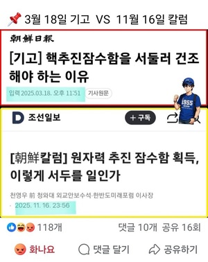 [굿모닝충청 조하준 기자] 지난 14일 한미 양국의 관세·안보 협상 결과물인 '조인트 팩트시트(공동 설명자료)'가 공개되며 한미 원자력 협정 조정 및 핵추진 잠수함 건조를 위한 양국 합의가 명시되자 조선일보가 16일 란 제목의 칼럼을 기고해 논란이 되고 있다. 이 칼럼이 문제가 되는 이유는 과거 자신들이 8개월 전에 했던 말을 손바닥 뒤집듯이 뒤집었기 때문이다.조선일보는 지난 3월 18일 고성윤 한국군사과학포럼 대표의 란 제목의 오피니언을