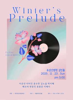 [굿모닝충청 조강숙 시민기자]대전을 기반으로 활동하는 젊은 연주자들이 결성한 에클라 앙상블(Eclat Ensemble)이 오는 23일(일) 오후 5시, 대전 유성선병원 김인홀에서 창단 연주회 ‘Winter’s Prelude(겨울의 서곡)’을 개최한다.이번 무대는 다가오는 겨울의 고요함 속에서 마음을 다시 한번 따스하게 채우는 시간을 전하고자 기획된 공연이다.이번 창단 연주회는 피아노, 성악, 관악이 조화롭게 어우러지며, 차이코프스키·생상스·바르톡·슈만·피아졸라 등 다양한 시대와 정서가 담긴 레퍼토리를 통해 관객에게 친숙하면서도 깊은