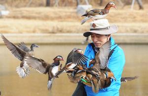 [굿모닝충청 채원상 기자] 새 아빠라 불리는 사람이 있다. 서산 버드랜드 앞에서 새를 키우는 서 새나라(64세) 씨다. 그가 새장을 열며 “나가자 얘들아” 한마디에 원앙과 비둘기들이 하늘을 날아오른다. 주위를 빙글빙글 돌며 동작 하나하나에 집중한다. 마치 영화의 한 장면처럼 주변에 모인 새들이 손과 머리에 앉는다. 야생 새들은 먹이를 먹고 나서도 그를 떠나지 않은 채 교감하고 있었다. 그는 원앙과 비둘기를 뒤로 하고 언덕 위를 올라 야생 새들에게 모이를 주러 나섰다. 공작과 호로니·금계·은계 등은 새장이 아닌 야생에서 살아가고 있었다.