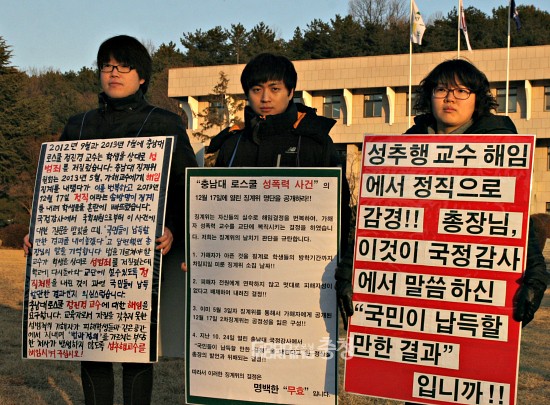 충남대 법학전문대학원(로스쿨) 학생회장단은 24일 "법을 교육하는 자가 성폭력을 저질렀다면 교육자로서의 직위를 박탈하는 것이 합당한 처분일 것"이라며 로스쿨 정모(50) 교수의 해임을 촉구했다.