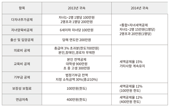근로소득자가 내야 할 세금을 연말에 다시 정확하게 계산해 정산하는 연말정산을 할때 공제(깎아주기)를 적용하는데 그 방식에는 소득공제와 세액공제가 있다. 그 동안 연말정산 시에는 소득공제가 적용됐지만 지난 2014년도 근로소득부터 세액공제로 변경되었다.