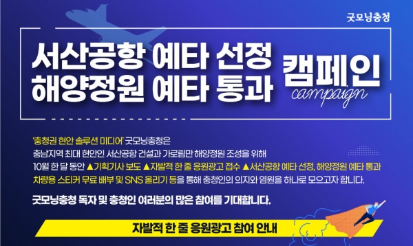 한편 굿모닝충청은 10월 한 달 동안 ‘서산공항 예타 선정, 해양정원 예타 통과’ 범 충남도민 캠페인을 진행 중이다.