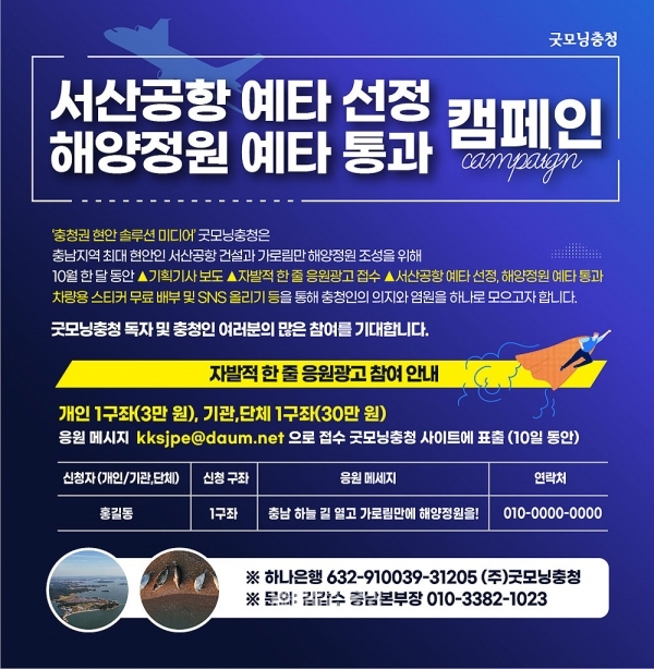 - <굿모닝충청>은 10월 한 달 동안 ‘충남공항 예타 선정, 해양정원 예타 통과’ 범 도민 캠페인을 진행하고 있다. 당부와 응원의 말씀 부탁드린다.