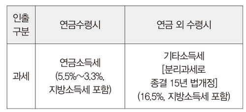 ·연금과세 : 연금수령 시 연금소득세 3.3~5.5%과세 (단, 세액공제 받지 않은 원금은 비과세)