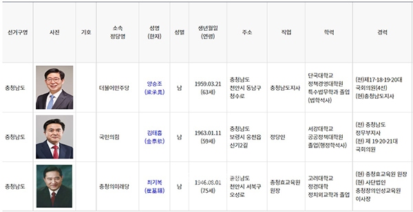 중앙선거관리위원회에 따르면 충남도지사 선거에는 재선에 도전하는 더불어민주당 양승조(63) 후보를 비롯해 국민의힘 김태흠(59) 후보, 충청의미래당 최기복(75) 후보 등 3명이 등록했다.