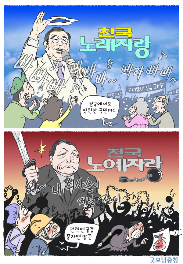 [굿모닝충청 서라백] 송해 선생이 영면했다. 향년 95세니 한 세기 가까이 대한민국 역사의 풍파를 겪으며 일생을 보낸 셈이다. 저 세상에서라도 고향 황해도 가족과 친지, 그리고 먼저가서 기다리고 있을 아들과 조우하길 기원드린다. 선생이 진행하던 전국노래자랑은 거리두기 완화 방침으로 진행자를 바꿔 야외 공개방송을 재개한다고 한다. 하지만 우리는 여전히 귀에 익은 주제곡과 함께 시작을 알리던 선생의 걸죽한 호령을 오래도록 기억할 것이다.