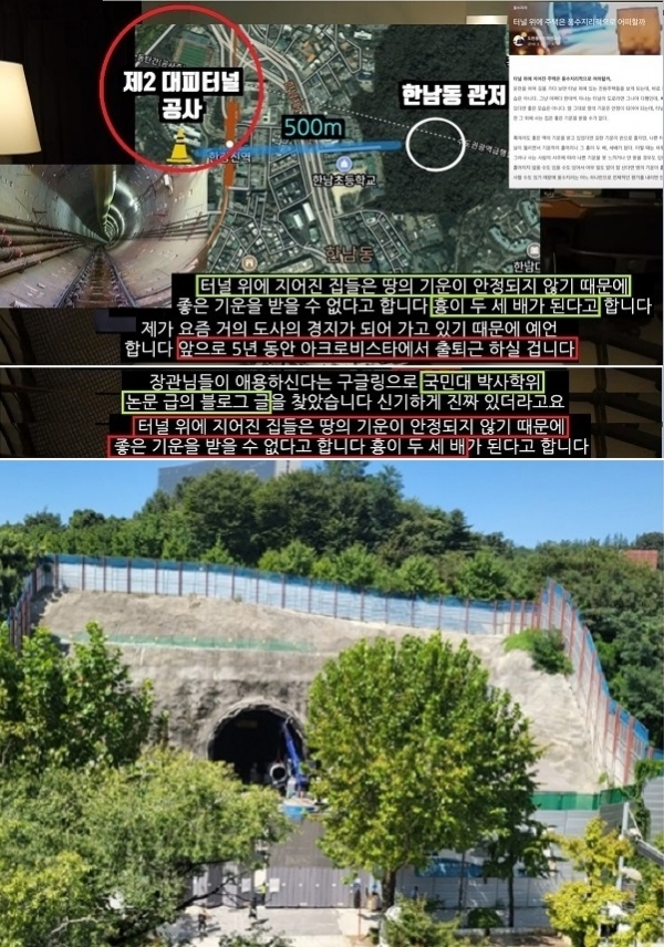 〈고양이뉴스〉 원재윤 PD도 전날 방송을 통해 “구글링으로 국민대 박사학위 논문급의 블로그 글을 찾았더니, 진짜 신기한 게 있더라”며 “터널 위에 지어진 집들은 땅의 기운이 안정되지 않기 때문에 좋은 기운을 받을 수 없다고 한다. 흉(凶)이 두세 배가 된다고 한다”고 귀띔했다.