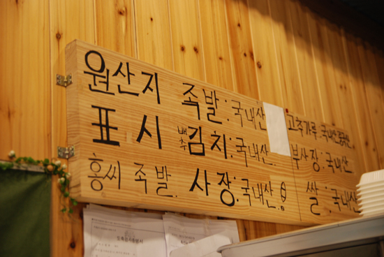이 집에서 족발을 시키면 김치전과 샐러드, 오이냉국, 콩나물국, 양파절임과 부추무침이 함께 나오고 새우젓, 직접만든 마늘소스과 쌈장이 곁들임 소스로 차려진다. 김치의 고춧가루나 배추부터 새우젓까지 모두 국내산을 사용한다. 이 가게는 국내산 아닌 재료의 출입금지구역이다.