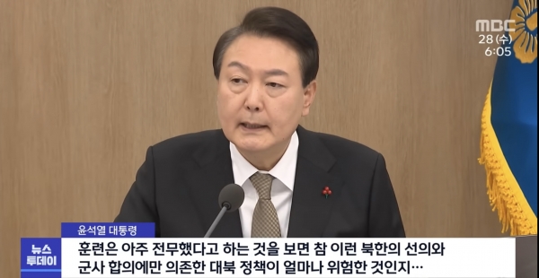 그보다 더 한심한 것은 윤석열 대통령의 대응 방식이다. 그는 전가의 보도처럼 또 문재인 정부 타령을 했다. 윤석열 대통령은 27일 오전 용산 대통령실에서 국무회의 모두발언을 통해 “지난 수년간 우리 군의 대비태세와 훈련이 대단히 부족했음을 보여주고 더 강도 높은 대비태세와 훈련이 필요하다는 것을 여실히 확인해준 사건”이라고 밝혔다. 그러면서 “지난 2017년부터 드론에 대한 대응 노력과 전력 구축이 제대로 되지 않고 훈련이 아주 전무했다는 것을 보면, 북한의 선의와 군사 합의에만 의존한 대북정책이 얼마나 위험한 것인지 우리 국민들이 잘 봤을 것”이라면서 전임 정부를 비판했다.