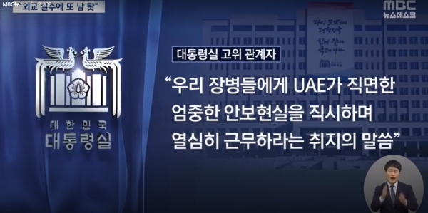 더군다나 지금 이란과의 외교 관계가 위기로 치닫고 있다. 순전히 윤 대통령의 말실수 때문이다. 이에 대해 비판하는 언론은 MBC 외에는 거의 찾아보기 힘들다. 이 사건으로 인한 파장이 커지자 대통령실은 해명이랍시고 "장병들에게 아랍에미리트가 직면한 엄중한 안보현실을 직시하며 열심히 근무하라는 취지"였다고 말하며 “이란 측에서 오해가 있었던 것 같다”, "오해가 풀리면 정상화가 신속하게 이뤄질 거"라고 말했다.