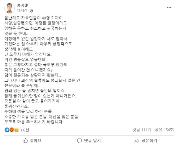 KBS 홍사훈 기자도 본인의 페이스북을 통해 “물난리로 자국민들이 40명 가까이 사망,실종됐으면, 예정된 일정이라도 양해를 구하고 취소하고 귀국하는게 맞을 듯 한데.. 예정에도 없던 일정까지 새로 잡아서 가겠다는 걸 아무리, 아무리 긍정적으로 생각해 볼려해도 난 도무지 이해가 안간다요.”고 지적했다. 진정한 국가 안보란 국민의 안위를 지키는 것이 국가 안보인데 윤석열 대통령은 그걸 모르는 듯하다.