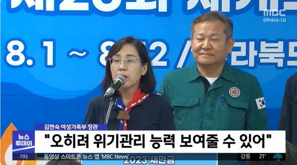 세계스카우트잼버리가 역대급 실패작으로 남게 되면서 여당 내에서 공동조직위원장이었던 김현숙 여성가족부 장관을 해임해야 한다는 주장이 대두되기 시작했다. 그리고 마침 9일 예정되었던 김현숙 장관의 브리핑이 전격 취소되면서 사실상 이미 경질 수순을 밟고 있는 것이 아니냐는 관측이 나오고 있다.