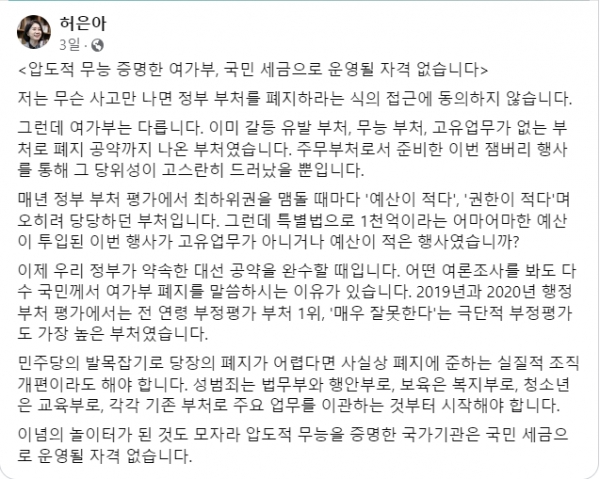 뿐만 아니라 같은 당 이준석 전 대표와 허은아 의원(비례대표) 등은 한술 더 떠서 아예 여성가족부 자체를 폐지해야 한다는 주장까지 내놓고 있다. 허은아 의원은 본인 페이스북에 <압도적 무능 증명한 여가부, 국민 세금으로 운영될 자격 없습니다>라는 제목의 글을 올리며 여성가족부 폐지론에 불을 지폈다. 이 글을 이준석 전 대표가 공유했다.