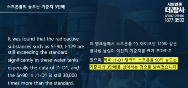그런데 이번 제보자 J의 메일에서도 동일한 사실을 구체적인 탱크의 위치까지 특정해서 알렸다. 그의 말에 따르면 앞서 언급한 그 4개의 탱크 중 J1-D1 탱크에서 스트론튬-90(Sr-90)의 농도가 기준치의 3만 배를 초과했다고 한다. 참고로 스트론튬-90이란 대단히 위험한 방사성 물질이자 발암 물질이다. 네이버 지식백과에서 스트론튬-90을 찾아보면 이렇게 적혀 있다.