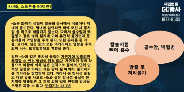 반감기도 무려 28년이나 될 정도로 대단히 길고 체내에 축적되면 골수암과 백혈병 등에 걸린다. 즉, 삼중수소보다 훨씬 심각한 피해를 주는 핵종이다. 쉽게 말해 이게 체내에 한번 들어오면 사실상 죽을 때까지 방사능을 내뿜는다는 뜻이다. 일본의 주장과 달리 이건 한 번 방출되면 처리할 방법이 없다.