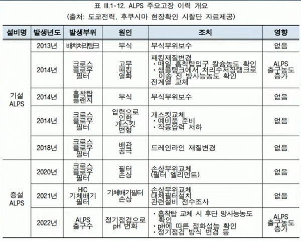 유국희 원자력안전위원장을 비롯한 '시찰단'이 후쿠시마에 가서 받아온 자료를 보면 ALPS를 그동안 크게는 8번, 자세하게는 40번의 보수를 했다고 한다. 그러나 이것은 거짓말이다. 대표적으로 2019년에 ALPS의 25개 필터 중 24개가 고장난 상태로 운전했다는 보도가 나온 적이 있다. 그런데 이 자료에는 그 사실이 없다. 즉, 일본은 저 장비의 문제점도, 성능도, 심각한 고장도 다 은폐하고 있다는 것이다.