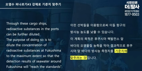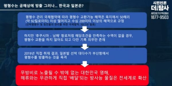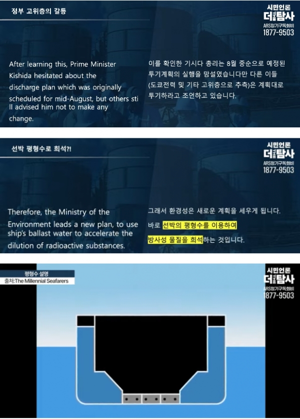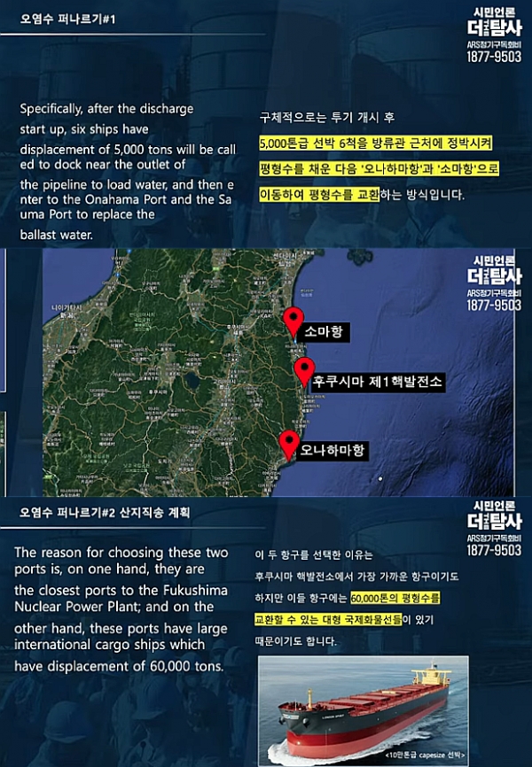 더탐사는 일본의 선박들은 현재까지도 우리나라 부산항에서 평형수를 계속 버리고 있는데 아무 제지도 받지 않은 채로 계속 반복하고 있다는 사실을 지적하며 만약 일본이 제보자 J가 제보한 내용대로 ‘평형수로 핵오염수 수송 계획’을 실시할 경우 부산 앞바다가 쑥대밭이 될 것이라고 경고했다. 덧붙여서 그렇게 한 다음 일본이 후쿠시마 앞바다보다 부산 앞바다에 핵종이 더 많다는 이유로 자국 수산물 수입까지 강요할지도 모른다고 경고했다.