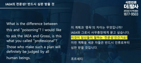 또 제보자 J는 일본의 후쿠시마 핵오염수 해양 투기 계획에 날개를 달아준 라파엘 그로시 IAEA 사무총장에게 “이 계획과 ‘중독’의 차이는 무엇인가?”, “이것이 당신들이 말하는 ‘전문성’인가? 이런 계획을 세운 자들은 반드시 인류로부터 심판 받을 것이다!”고 일침을 가했다.