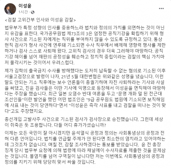 먼저 이성윤 전 서울중앙지검장은 6일 자신의 페이스북에 〈검찰 고위간부 인사와 이성윤 감찰〉이란 제목의 글을 올리며 손준성 검사를 검사장으로 영전시킨 한동훈 법무부를 강력하게 비판했다. 이 전 지검장은 법무부를 향해 “법무부가 특정 성향의 인사를 중용하느라 법치와 정의의 가치를 외면하는 것이 아닌지 유감을 표한다.”고 비판했다.