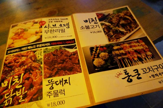 차림표 ▲샤브오뎅 무한리필 1만 9000원 ▲뚱대지 주물럭 1만 8000원 ▲미친소불고기 1만 6000원 ▲통큰꼬치구이 1만 8000원 ▲미친닭발 1만 6000원 ▲화산불닭 1만 9000원 ▲미친통닭 1만 6000원 ▲대한민국 육회 2만 1000원 ▲오리훈제 샐러드 1만 6000원