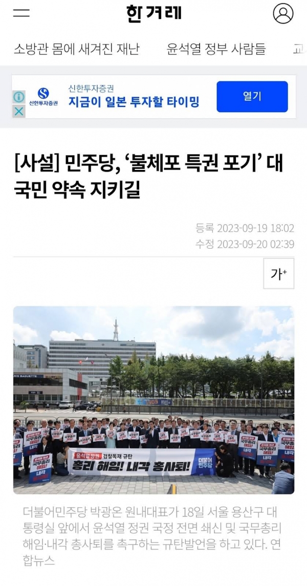현재 기성 언론들은 은근슬쩍 민주당 의원들에게 체포동의안 가결 표를 던지도록 몰아가고 있다. 그 기성 언론 중에는 한겨레도 있다. 한겨레는 〈민주당, ‘불체포 특권 포기’ 대국민 약속 지키길〉이란 사설을 내어 민주당 의원들로 하여금 이재명 대표 체포동의안 표결에 가결 표를 던지게끔 대놓고 종용했다.
