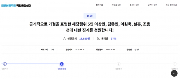 더불어민주당 혁신기구인 더민주전국혁신회의에서 지난 21일 이재명 대표 체포동의안에 가결표를 행사한 것으로 보이는 김종민, 이원욱, 조응천, 이상민, 설훈 의원 등 5인의 출당 요구 논평을 냈는데 국민응답센터에도 비슷한 내용의 청원이 24일에 올라왔다. 25일 오후 3시 기준 동의율이 벌써 37%나 되었을 정도로 역시 빠른 속도로 동의율이 높아지고 있다.