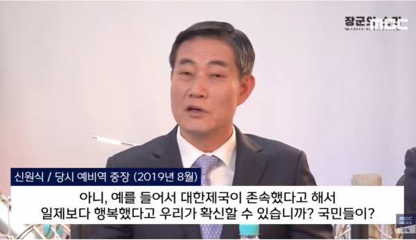 25일 한겨레 단독 보도 기사 〈국방장관 후보 “대한제국이 일제보다 행복했겠나” 망언〉을 참고하면 신원식 후보자가 2019년 8월 14일 대한민국수호예비역장성단이 운영하는 유튜브 채널 ‘장군의 소리’에 출연해 ‘[특별대담] 한일갈등, 지소미아 어떻게 될 것인가?’라는 제목의 영상에서 신 후보자는 “문재인 정부는 의도적으로 한일관계를 악화시켰다. 이럴 때 국민이 바로잡아야 한다. 반일과 극일이 무엇인가 또는 19세기 말 시대적 상황을 생각해야 한다”고 했다.