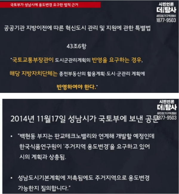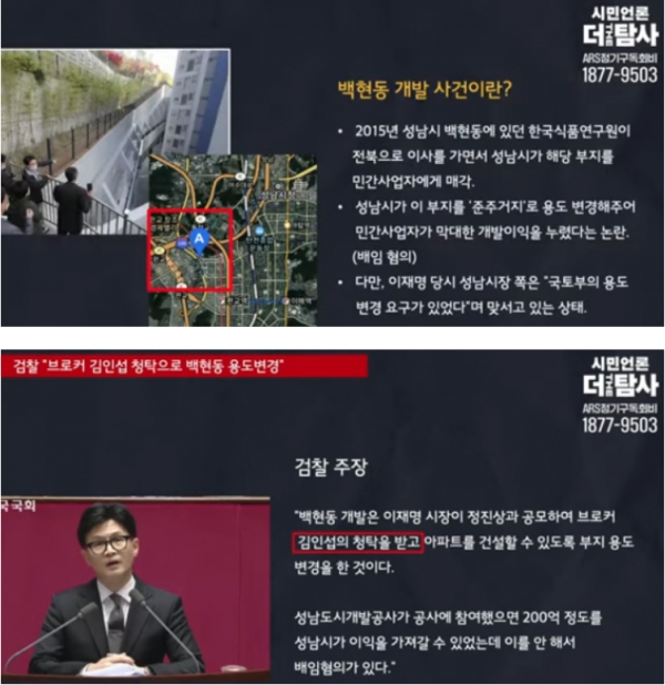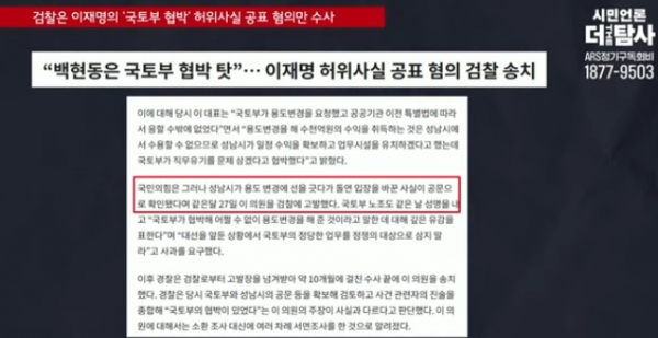 이번에는 백현동 200억 원 배임에 대해서 검찰 수사가 얼마나 문제가 있는지를 보도했다. 즉, 한국식품연구원부지의 용도 변경이 국토부 외압에 의한 것인지, 아니면 검찰의 주장대로 선거 브로커 김인섭의 청탁을 받고 이재명 당시 성남시장이 허가한 것인지에 대한 보도이다.