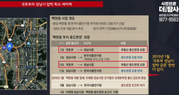 이재명 당시 성남시장은 이 백현동 부지가 판교테크노밸리 인근이어서, 아파트를 짓기보다는 대기업 본사나 R&D 센터를 유지하는 것이 낫겠다는 판단을 하고 있었다고 했다. 그런데 국토부가 3차례나 성남시를 압박하는 공문을 보냈다. 기존 언론은 국토부가 공문을 보낸 게 두 번이라 하지만, 2015년 1월에 한 번 더 있었다.