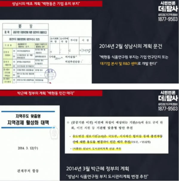 이재명 당시 시장의 성남시는 분명히 백현동 식품연구원 부지를 "대기업 본사 및 R&D센터로 개발한다"는 목표를 세우고 있었다. 그러나 당시 박근혜 정부는 데드라인까지 정해 놓고 이 부지를 민간에 매각하라는 지시를 내린 상태였다. 그러니 식품연구원도 이런 박근혜 정부를 믿고 부지를 민간매각하겠다며 성남시를 압박했던 증거가 명백하게 있다.