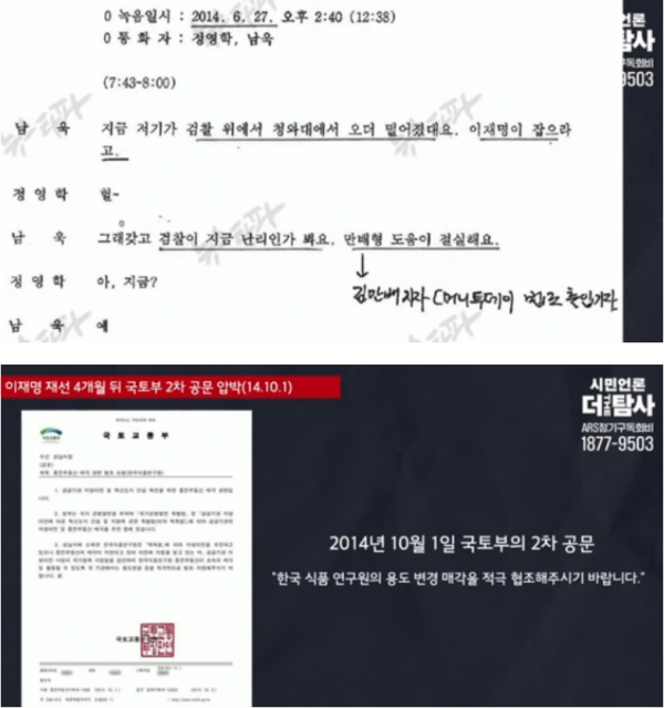 이재명 당시 성남시장은 저런 노골적인 압박에도 굴하지 않고 해당 부지를 공영개발하겠다고 공약했고, 결국 2014년에도 성남시장에 재선됐다. 그러자 박근혜 정부가 직접 나서 압박수위를 높이기 시작했다. 박근혜 정부는 대놓고 검찰을 움직여 이재명 성남시장 죽이기에 나섰다. 이런 사실이 대장동 세력의 녹취록에 명확하게 드러나 있다. 그리고 국토부가 위와 같이 백현동 부지를 대놓고 민간에 매각하라는 노골적인 내용이 담긴 공문을 성남시에 보냈다.