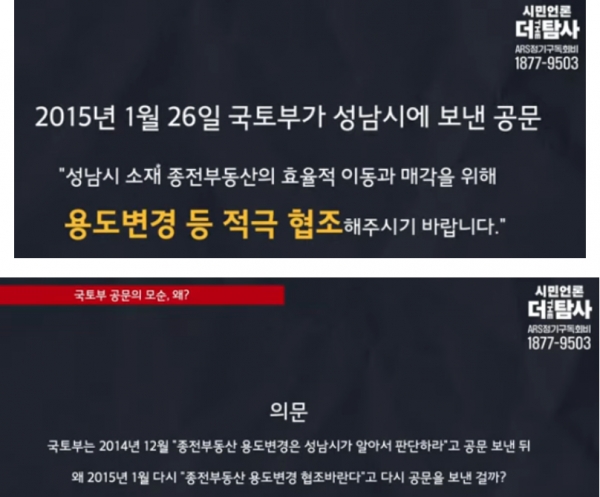 그러자 국토부는 세 번째 공문을 보냈는데 아예 대놓고 용도변경을 하라고, 속내를 드러낸 문건이었다. 한달 전까지는 콕 찝어서 질의해도 "알아서 해"라던 국토부가, 이제 와서 적극 협조 요청 공문을 보냈다는 게 무슨 뜻일까? 더구나 이재명 성남시장은 "성남시 공무원들을 국토부가 직무유기로 문제삼겠다며 위협했다"라고까지 했다.