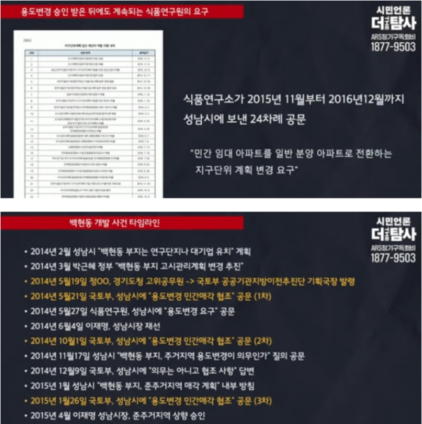 거기다 식품연구원은 기고만장해져서, 무려 24번이나 성남시에 이 지역 아파트 건설을 일반 분양 아파트로 전환해 달라는 내용의 공문을 보냈다. 그러나 엄희준 이하 검찰들과 조중동 등 수구 언론들은 이런 사실을 철저히 외면한 채 ‘이재명 악마화’ 작업에만 치중했다.
