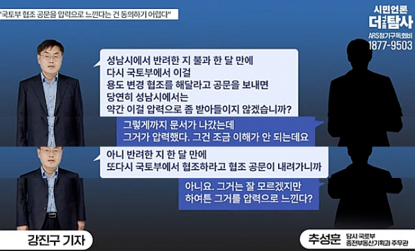 한편, 더탐사 취재진들은 엄희준 이하 정치 검찰들이 전혀 수사하지 않았던 문제의 인물들을 직접 만났다. 우선 당시 국토부 주무관이자 현재 서울지방국토관리청에 있는 추성훈 과장을 만났다. 그는 강진구 기자와의 인터뷰에서 자신들이 보냈던 그 공문은 압력을 가한 게 아니라고 당당하게 말했다. 또한 그 공문은 누구의 지시도 없이 본인 판단으로 보냈다고 했다.