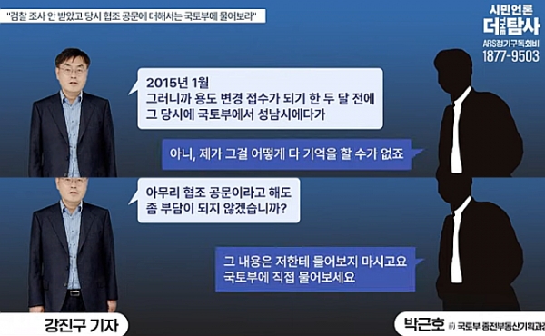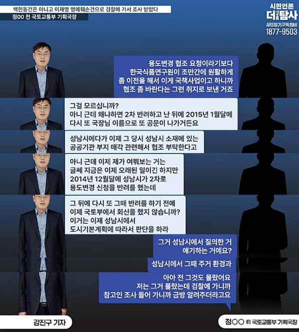 강진구 기자와의 인터뷰 당시 이 사람의 답변을 통해서도 검찰은 백현동 건이 아니라 오로지 "이재명 명예훼손"으로 조사를 했다는 사실이 확인되었다. 백현동의 부적절한 용도변경에 국토부가 개입했는지는 검찰이 전혀 수사하지 않았다는 것이다. 또 이 사람은 한술 더떠, 이재명 당시 성남시장이 얼마든지 변경할 수 있었는데 왜 그냥 변경 안해줬는지 이해가 안 간다는 푸념을 늘어놓기도 했다.