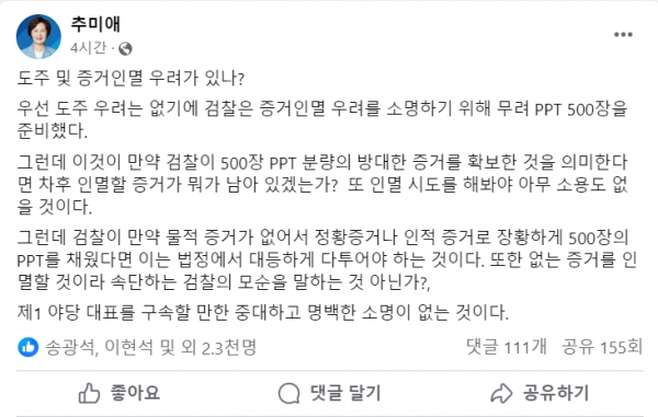 또 추 전 장관은 “그런데 검찰이 만약 물적 증거가 없어서 정황증거나 인적 증거로 장황하게 500장의 PPT를 채웠다면 이는 법정에서 대등하게 다투어야 하는 것이다. 또한 없는 증거를 인멸할 것이라 속단하는 검찰의 모순을 말하는 것 아닌가?”라고도 지적했다.