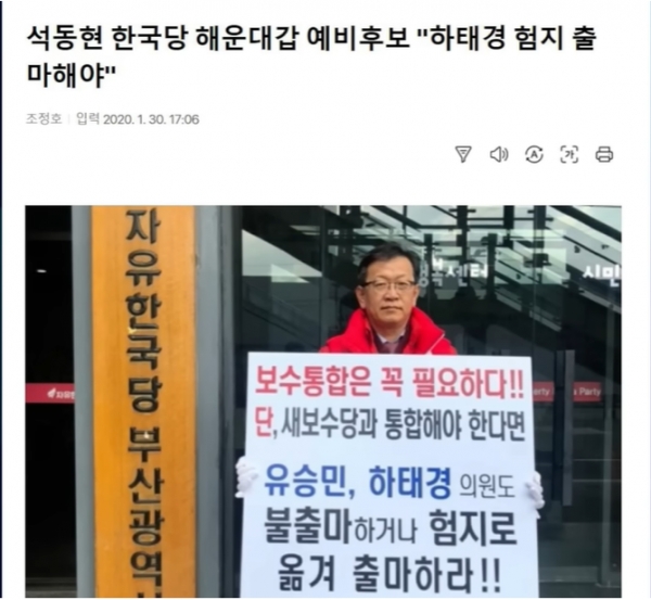 석동현 변호사는 지난 2020년 21대 총선 때에도 부산 해운대구 갑에 미래통합당 예비후보로 총선에 출마했다. 그 때 석동현 변호사는 하태경 의원과 유승민 전 의원을 향해 수도권 험지 출마를 강권하는 피켓을 들고 연일 시위를 벌였다. 그 당시에는 하태경 의원이 경선에서 승리해 해운대구 갑에 출마했고 3선에 성공했다.