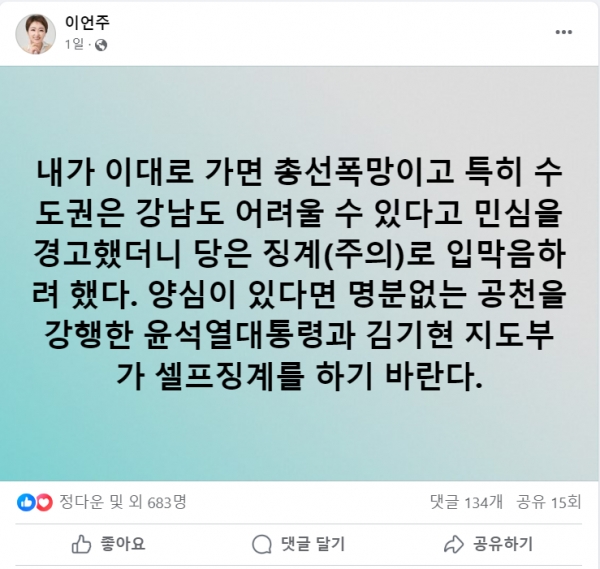 13일 국민의힘이 페이스북에 ‘총선 폭망’ 경고를 한 이언주 전 의원에게 징계를 내린 소식이 알려졌다. 이에 이언주 전 의원은 이번 서울 강서구청장 재보궐선거에 명분 없는 공천을 한 윤석열 대통령과 김기현 지도부가 ‘셀프 징계’를 하기 바란다고 목청을 높였다.