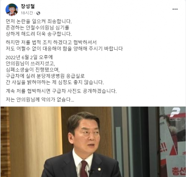 이에 장성철 소장은 그 날 페이스북에 글을 올리며 “먼저 논란을 일으켜 죄송합니다. 존경하는 안철수의원님 심기를 상하게 해드려 더욱 송구합니다.”고 먼저 사과를 전했다. 그러나 그러면서도 “하지만 저를 법적 조치 하겠다고 협박하셔서 저도 어쩔수 없이 대응해야 함을 양해해 주시기 바랍니다.”고 해 자신의 말이 거짓말이 아니라고 했다.