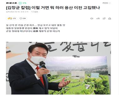 19일 조선일보는 김창균 논설주간의 〈이럴 거면 뭐 하러 용산 이전 고집했나〉란 제목의 칼럼을 실으며 윤석열 정부 때리기에 나섰다. 이 칼럼을 살펴보면 먼저 눈에 들어오는 부분이 있다.