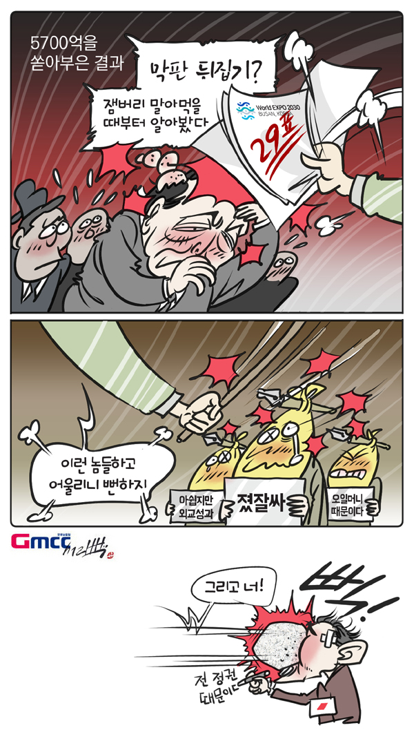 [굿모닝충청 서라백] '혹시나'는 '역시나'였다. 부산 엑스포 유치는 일장춘몽으로 끝났다. 막판 역전극이 벌어질 것이라는 기대와 달리 전체 165표 중 29표를 얻는데 그쳤다. 비율로 따지면 17.6%에 불과하다. 2년간 쏟아부은 5700억의 홍보 예산은 다 어디로 갔을까. '대한민국 영업사원 1호'의 처참한 성적이다.