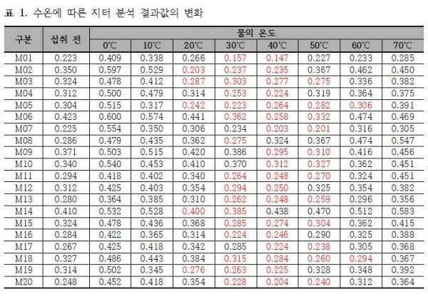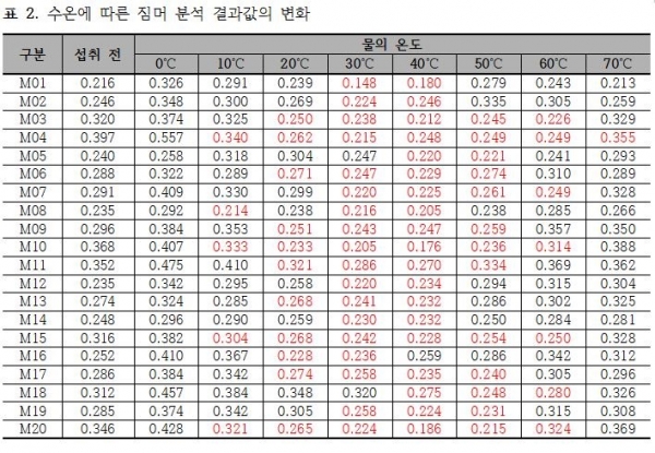 실험 결과 아래 표 1은 물의 온도 변화에 따른 피실험자 집단의 지터 변화값을 측정한 것이며 표 2는 동일한 환경에서 피실험자 집단의 짐머 변화값을 측정한 것이다. 표 1과 표 2에서 물을 섭취하기 전보다 분석 결과값이 낮게 나타나 성대에 안정감을 주는 것으로 출력된 부분에서는 붉은색으로 표시하였다.