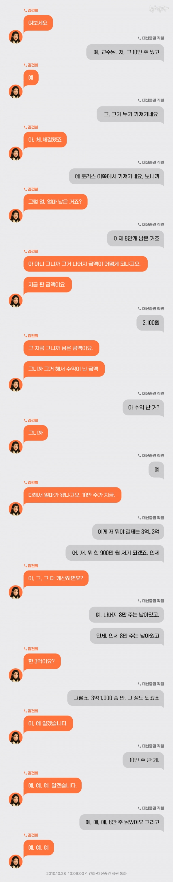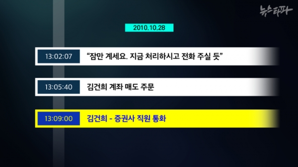 그런데 뉴스타파가 새롭게 입수한 김건희 여사와 대신증권 직원 사이의 통화 녹취록에 따르면 이날 주문을 낸 주체는 김건희 여사라 한다. 위 그림은 뉴스타파가 입수한 2010년 10월 28일 오후 1시 9분 정각 김건희 여사와 대신증권 직원 사이의 통화 녹취록이다.