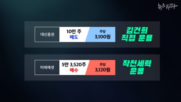이 날 대신증권 계좌에서 10만 주를 3,100원에 매도한 김건희 여사가 미래에셋 계좌에서 똑같은 도이치모터스 주식을 더 비싼 주당 3,120원으로 5만 3,520주를 사들인 것이다. 3억 조금 넘는 정도의 주식을 팔고 같은 날 다시 더 비싼 값에 1억 6,000여만 원어치를 사들인 셈이다. 뉴스타파는 이렇게 서로 상반된 거래를 한 이유가 대신증권 계좌는 김건희 여사가 직접 운용했지만 미래에셋 계좌는 2차 작전 세력이 운용했기 때문이라 설명했다.