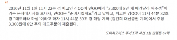 판결문 속 내용을 정리하면 이 날 오전 11시 22분, 작전 세력 사이에 12시쯤 통정매매를 하자는 취지의 문자 메세지가 오갔고, 11시 44분 32초 매도하라는 지시가 문자 메시지로 전달됐다. 그리고 7초 뒤인 11시 44분 39초, 김건희 여사의 대신 증권 계좌에서 매도 주문이 제출됐다. 대신증권 직원이 김건희 여사에게 전화를 건 것은 그로부터 50초 뒤인 11시 45분 29초다.