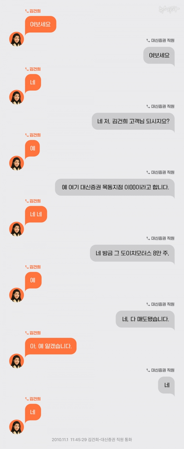 뉴스타파는 2010년 11월 1일 오전 11시 45분 경 김건희 여사와 대신증권 직원 사이의 통화 녹취록을 입수해 공개했다. 공개한 녹취록은 아래 그림과 같다.