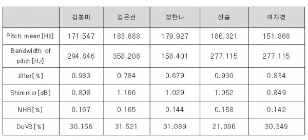 실험대상자 5인에 대해 음 높이, 음 높이의 편차, 신회도와 관련되어 있는 음성 분석 요소인 주파수변동률, 진폭 변동률과 NHR에 대한 실험 결과를 살펴보면 세계적 여성 지휘자 5인의 실험 결과에 대한 내용은 다음과 같다.