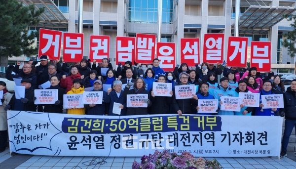 이들은 8일 대전시청 앞에서 기자회견을 열고 “지난 5일 윤 대통령은 대장동 특검, 김건희 특검을 더한 이른바 쌍특검에 즉각 거부권을 행사했다”며 “윤 대통령은 자신의 배우자인 김건희 여사가 연루된 사건의 조사를 정면 거부했으며, ‘대통령 재의요구권’을 가족 비리 감추는 방탄권으로 전락시켰다”고 밝혔다.