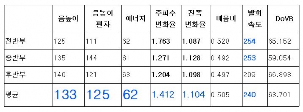 - 무엇보다 주파수변동률과 진폭변동률 수치를 평소보다 아주 좋게 함으로써 계산적으로 신뢰도에 초점을 맞춘 음성